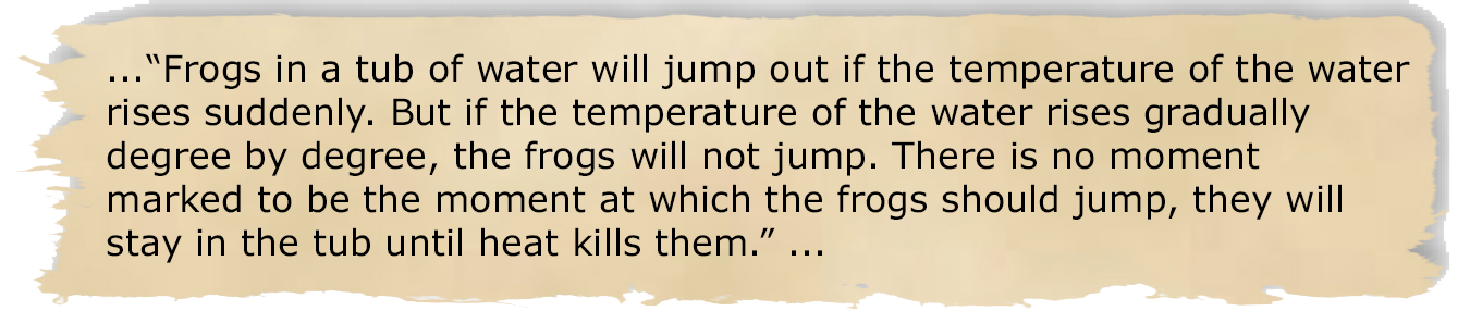 Der Anthropologe, Kybernetiker und Informationstheoretiker Gregory Bateson beschreibt in seiner Theory of Mind, wie sensorische Organe auf Unterschiede oder Veränderungen reagieren. Nachdem unser Verstand Informationen nur mittels Unterschiedsbildung verarbeiten kann, ist es sehr schwierig, zwischen einer langsamen Veränderung und einem Zustand zu differenzieren.